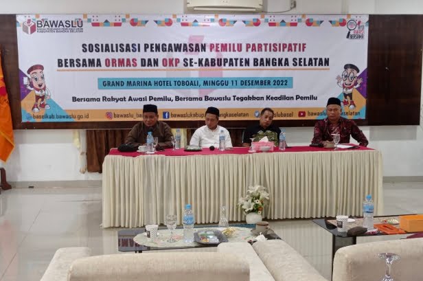 TOBOALI, SUARABAHANA.COM — Badan Pengawas Pemilu (Bawaslu) Kabupaten Bangka Selatan menggelar sosialisasi pengawasan pemilu partisipatif bersama Ormas dan OKP di Hotel Grand Marina Toboali, Minggu (11/12/2022).